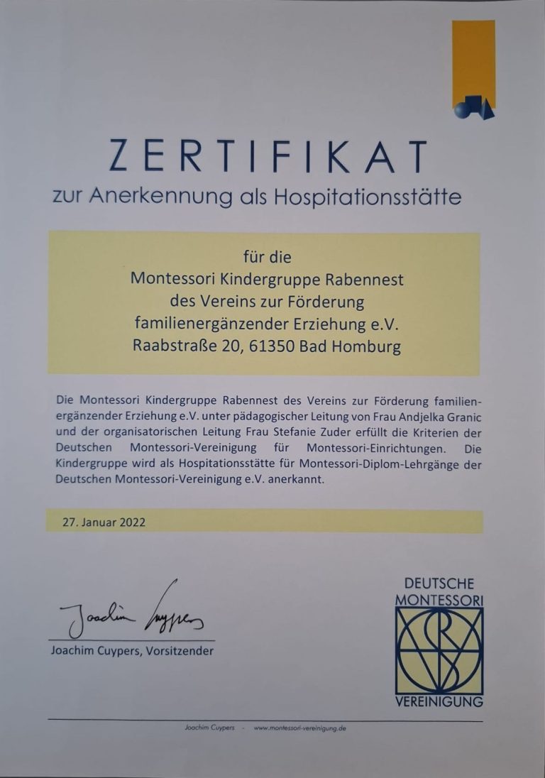Im Zertifikat heißt es: “…Die Kindergruppe Rabennest überzeugte durch eine besonders kind- und elternorientierte Konzeption zur Eingewöhnung sowie deren Umsetzung in die Praxis…”